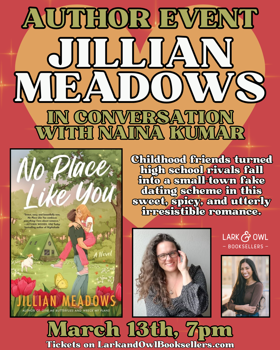 Join us at Lark & Owl Booksellers to celebrate the release of NO PLACE LIKE YOU by Jillian Meadows! Jillian will be in conversation with Naina Kumar, author of FLIRTING WITH DISASTER.
